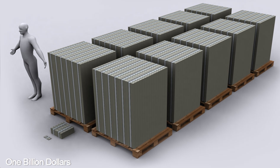 The first pile is $1K, the second in $1M, and all the pallets make up $1B (in fresh C notes)