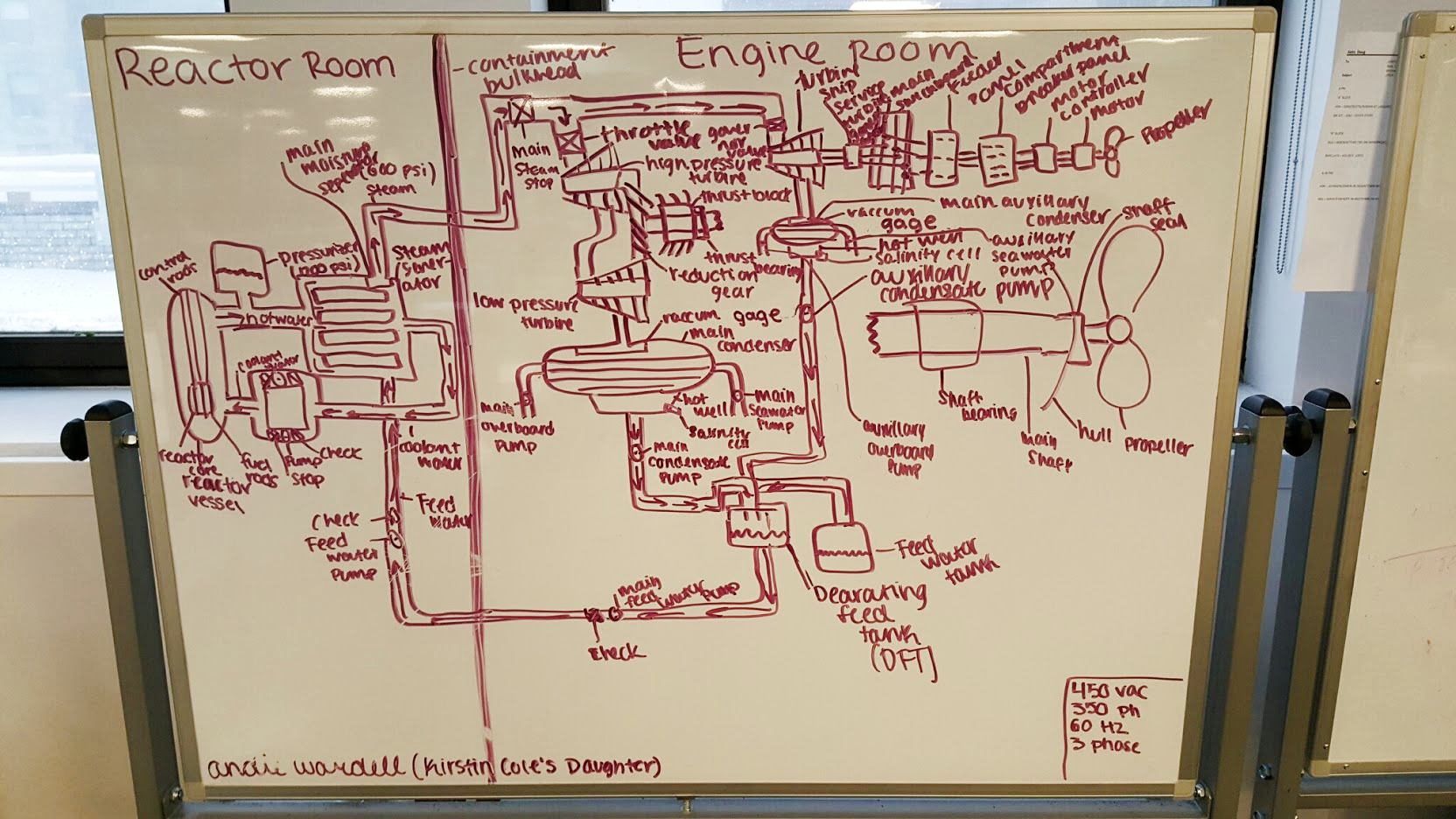 One main prop driven directly by a steam turbine, another driven by electric motor charged by a separate ship service steam turbine? Or is that second prop just the fan to heat the captain's head?