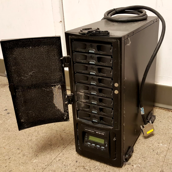 Slowly but surely locating and eliminating some of the more ancient server hardware in the facility. This creaky old Winchester-brand array was connected to a Linux machine I didn't even know we had, and which was being used for precisely one extremely trivial application because our chief meteorologist clings to old things which barely work out of sheer stubbornness. It had two failed drives and was making an awful noise, but was still somehow clinging to life.