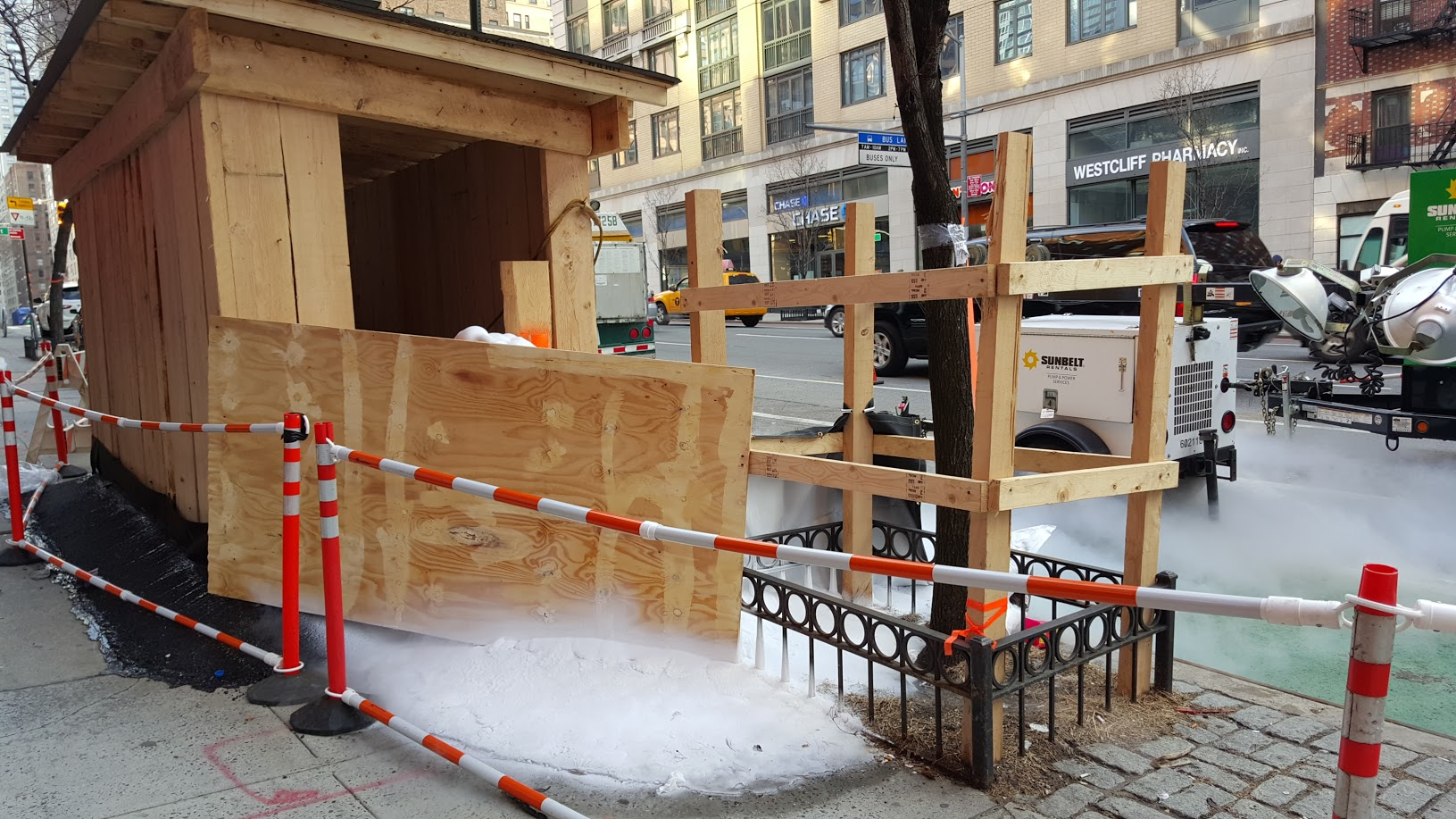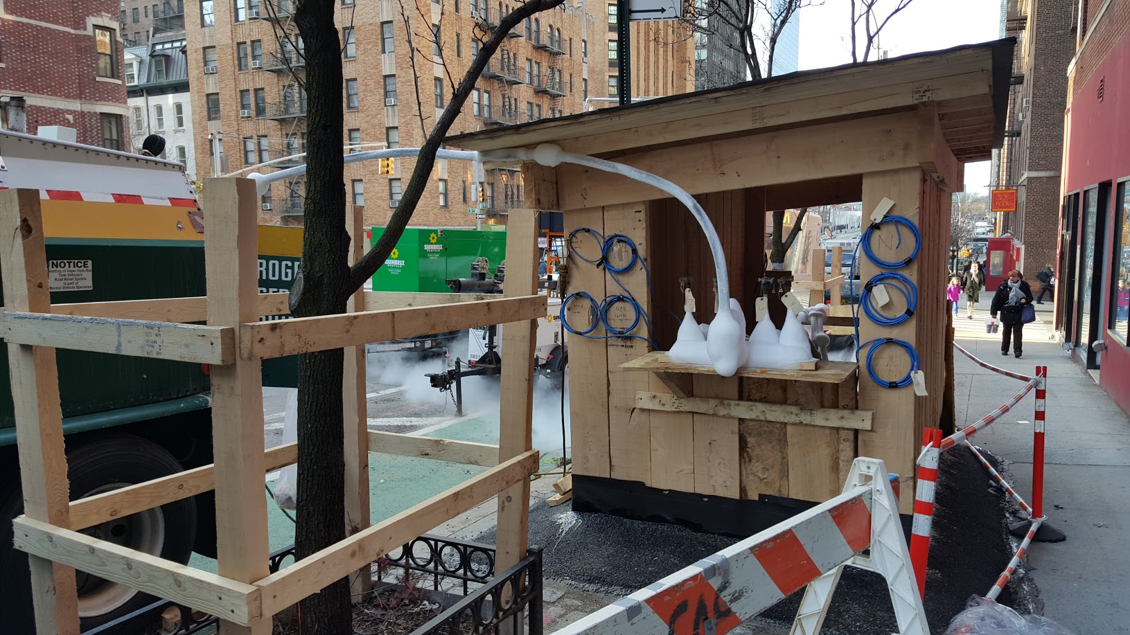 The trucks around the hole all say "Con Edison" on the side, as do the worker's uniforms. So clearly, this is a front company owned by Hans Gruber's nephew. It is, after all, just two blocks north of both the United Nations headquarters and the Trump World Tower.