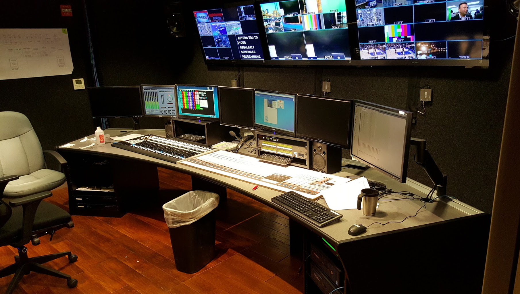 Earlier today, I was in the new audio control room. We're finished with construction and wiring, and are down to configuration. I was sitting at the left console, applying little P-touch labels to every fader strip to denote the functions of all of the programmable buttons. Tedious, repetitive work.
