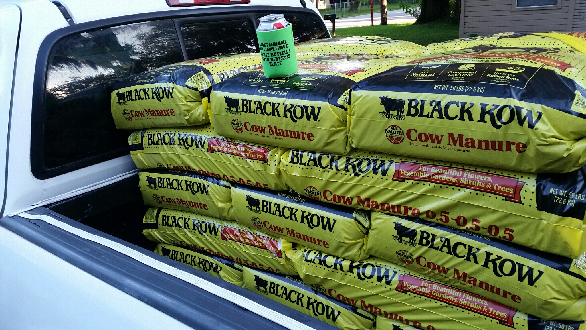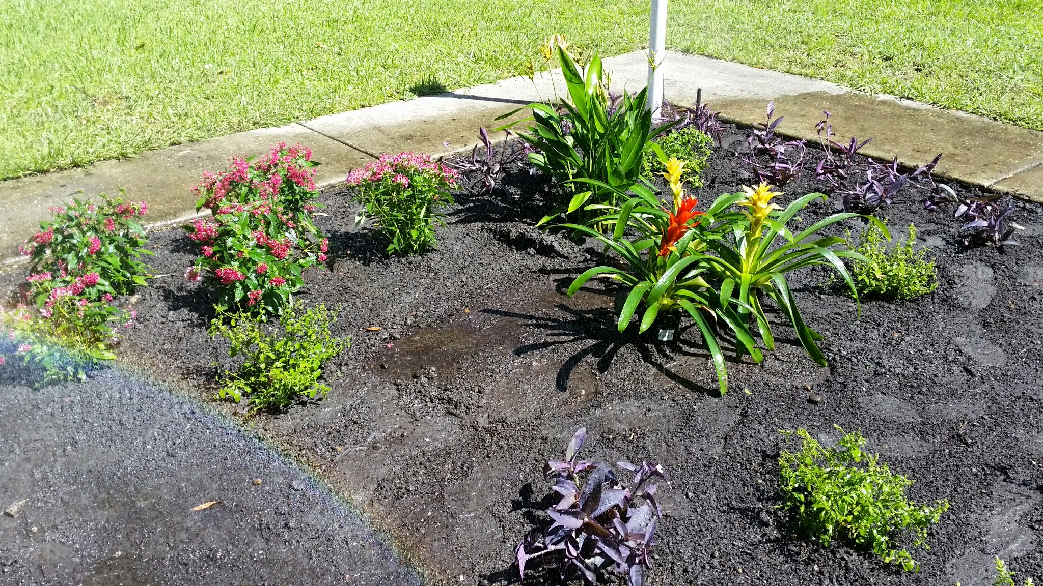 It's landscaping season for me. Just ripped all the old foliage out of the front flowerbed, tilled in 1300lbs of composted cow manure, and started sticking tropical plants in the ground. Many more plants to go, but here's a progress shot: