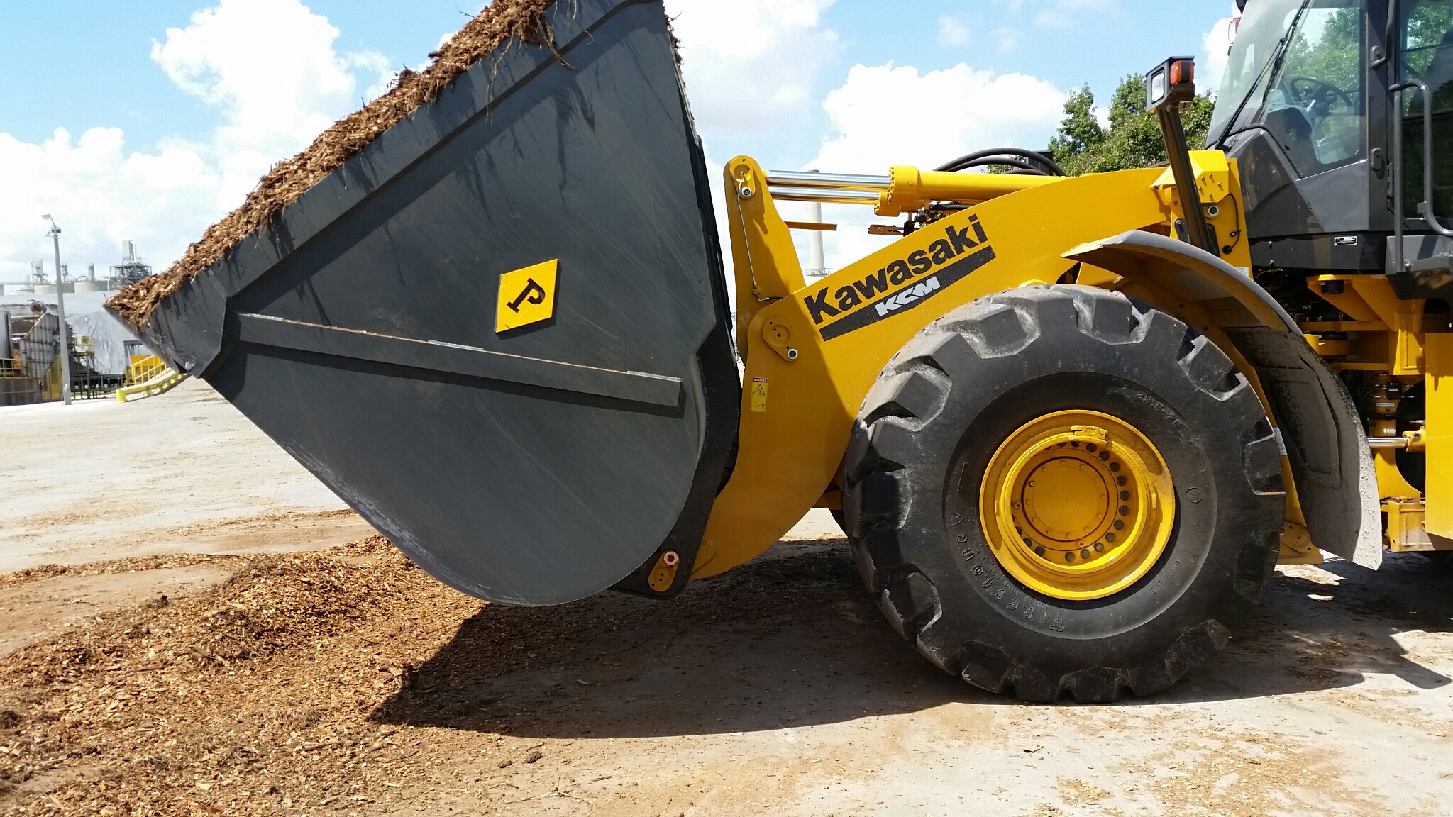 Here is a picture of one of my machines with a 19 cubic yard bucket pushing mulch up into a pile after being deposited there by a 100 yd walking floor tractor trailer.