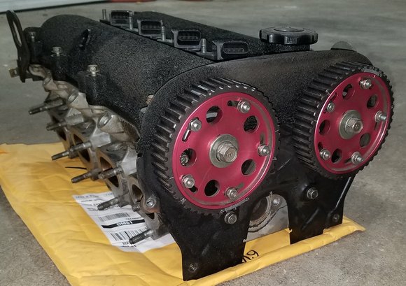 Exhaust cam retarded due to clockwise rotation and camshaft is positioned more CCW on the pulley. Thus opens (and closes) later the neutral position.