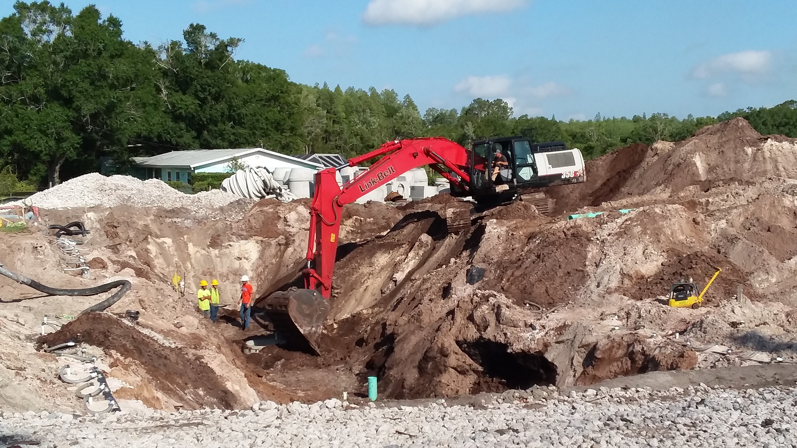 Here is a shot from Friday morning. The screw is putting sanitary sewer in for a new subdivision right next to a creek. It is entirely too deep and wet with lots of well pointing trying to keep the water intrusion down until they can finish. This is because the developer is trying to save money and not pay for more than one lift station.