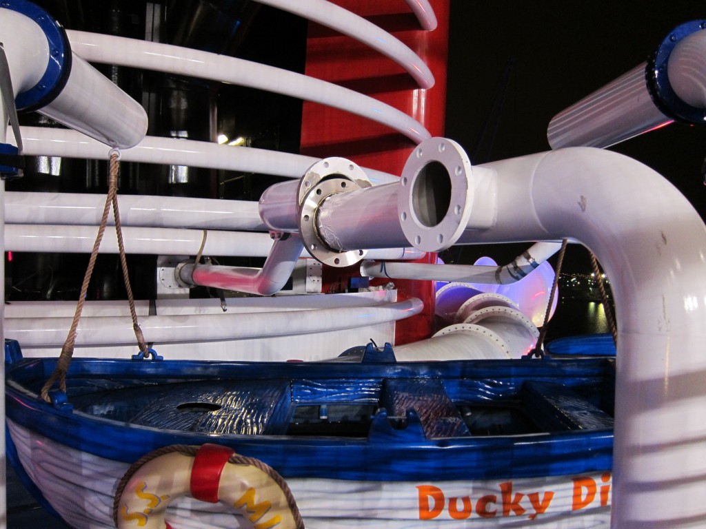 The picture above is just a small part of a ridiculously complex system of plumbing that no doubt gave some solidworks designer multiple orgasms as he was drawing it, and yet serves the simple purpose of pumping water from the pool system up into the top of the aft funnel in order to supply the AquaDuck. A single, straight section of pipe with one 90 degree bend would have sufficed, but that wouldn't have looked cool enough.