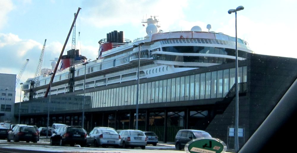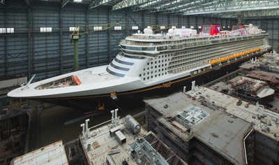 It's Fantasy, the fourth ship in the Disney Cruise Lines fleet. They're based in the US, however the ship is being constructed in Germany by Meyer Werft. She left the shipyard a few weeks ago and moved to Bremerhaven for final outfitting. On the 16th they depart for the US, arriving in New York on May 1 for the christening, then heading down to Port Canaveral in Florida to begin her normal Caribbean service.