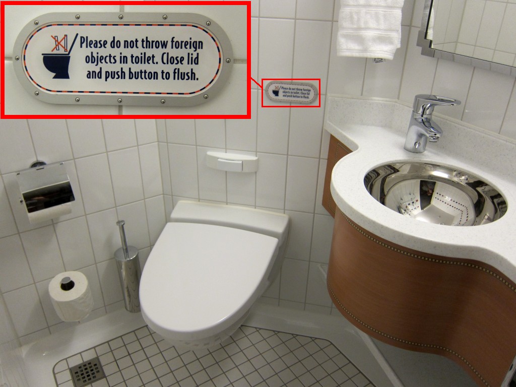 This is a Finnish toilet, installed on a German ship which is owned by an American company and is registered in The Bahamas. The first thing which I deposited into it was the remains of an Italian dinner served to me by a Dutch stewardess while flying in a French airplane over international waters.