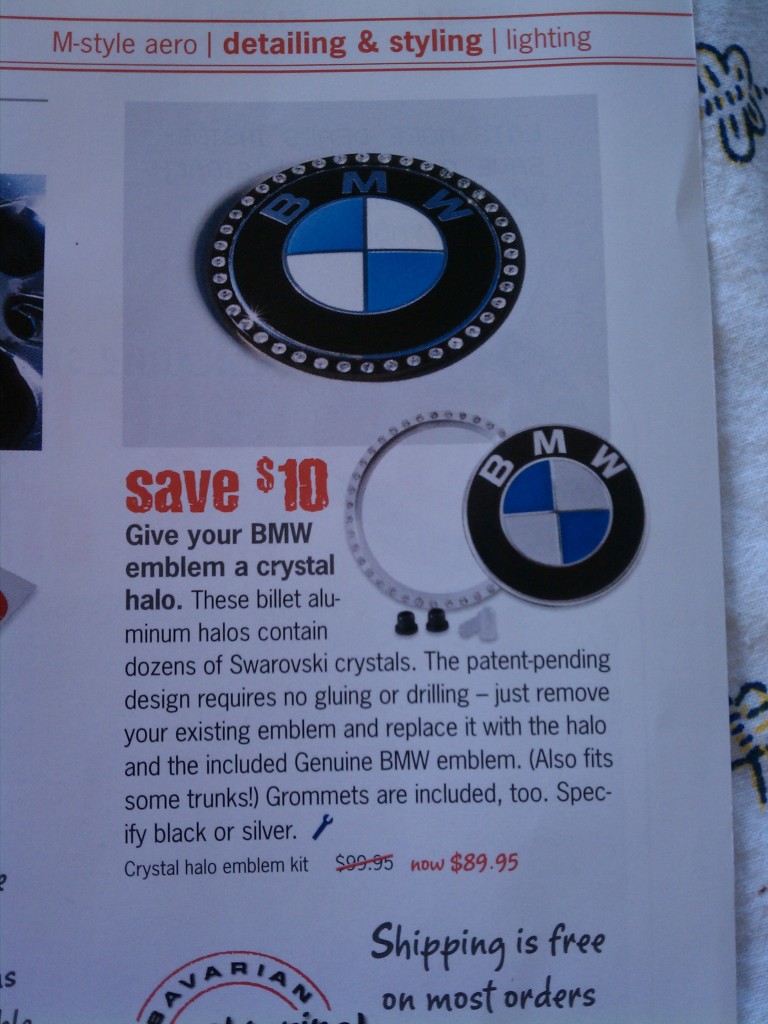 Oh look! For only $90 you can get a Swarovski crystal surrounded emblem! Requires no drilling or gluing! Fits some trunks too, so you can bling coming or bling going!