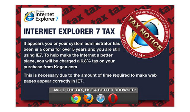 Australian electronics retailer Kogan has started imposing a 6.8% tax on customers still using Internet Explorer 7 on account of "the amount of time required to make web pages appear correctly" with the browser.