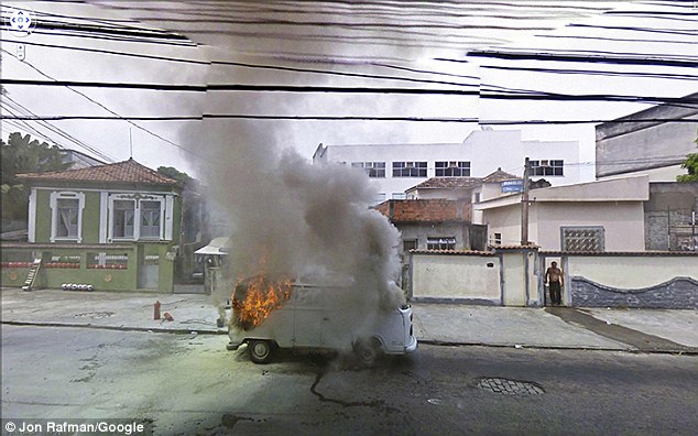 Wheels on fire: A camper van sits ablaze on a street in Rio De Janeiro, Brazil