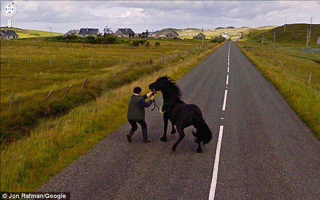 A man struggles to control a horse on the Isle Of Lewis off the north-west coast of Scotland