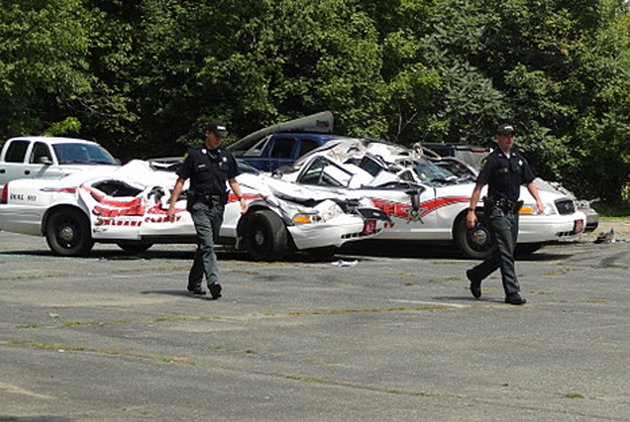 Martin estimated damage to the vehicles at more than $300,000. Not only were their roofs and hoods caved in, "the radios are ruined, the radar detectors, the cages in the cars ... We're going to have to get the jaws of life up here to pry the trunks open and see about the rifles and shotguns," Martin said.