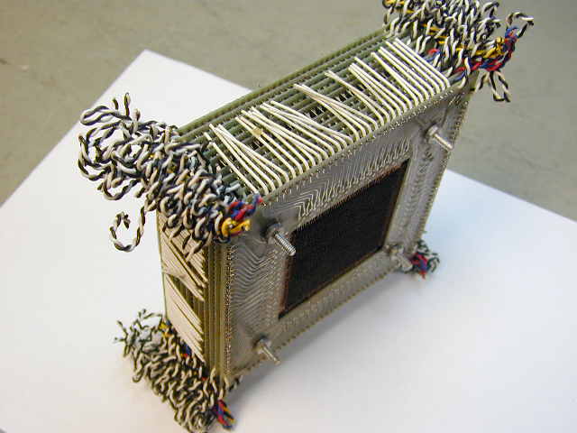 Core memory evolved over the years in a process which somewhat resembles Moore's Law today. Here, for instance, is a core from the old Whirlwind computer, in which you'll note that vacuum tubes are used as the read/write amplifiers: