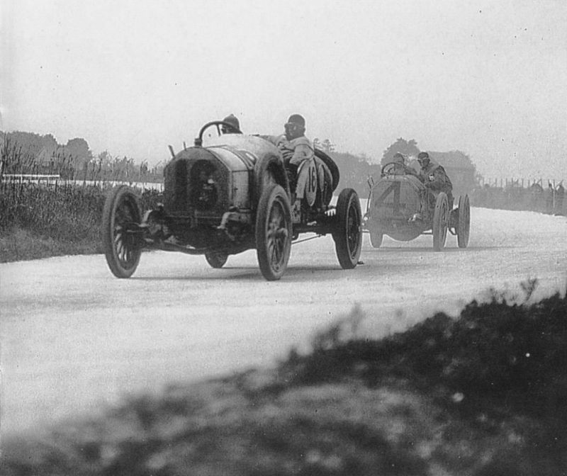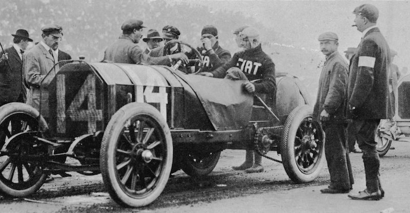 The winner of the first American Grand Prize at Savannah, Georgia was Frenchman Louis Wagner (at the wheel) in his 120 bhp Fiat. Check out the chain drive and the mechanical hand brake operated by the co-driver that only works on the rear wheels.