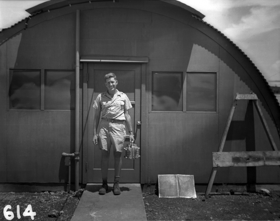 The happy-looking fellow posing outside the Quonset hut in his cute little shorts is Harold M. Agnew, physicist and future director of Los Alamos National Laboratory.
