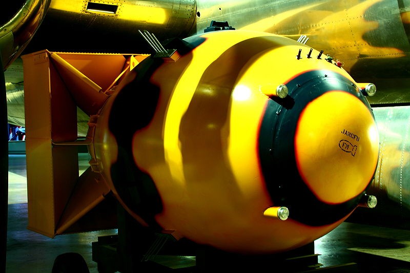 This is a Fat-Man type bomb, on display at Wright-Patterson AFB Museum in Dayton, OH. In the background is the Bockscar B-29 which dropped the Fat Man bomb on Nagasaki. (Not a replica, the actual for-real airplane.)