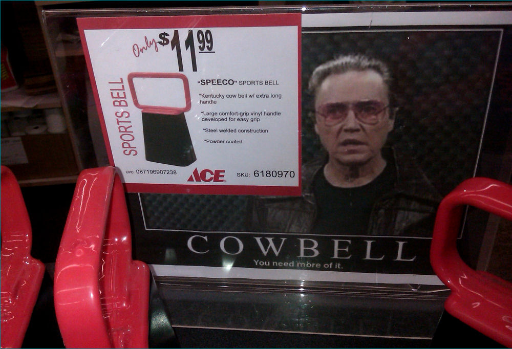At the checkout counter of the local ACE hardware, they are advertizing cowbells for sale. Here is the placard which a store employee created to promote them: