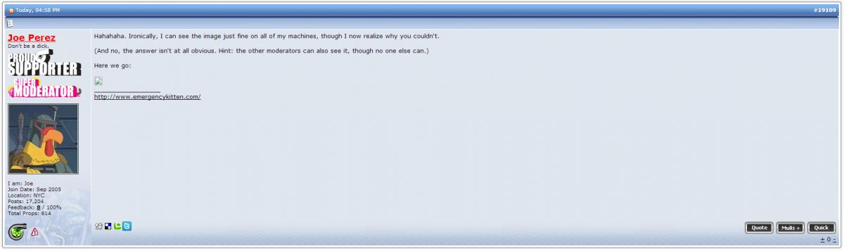 Hahahaha. Ironically, I can see the image just fine on all of my machines, though I now realize why you couldn't.