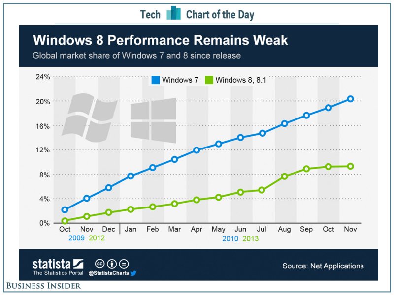 XP gained less than 10% of the market in its first year as well, mostly because people just didn't see a compelling need to jump ship from 98SE (consumer) and 2000 (business.) And yet it went on to become one of the most dominant, long-lasting OSes in the history of the x86 platform.