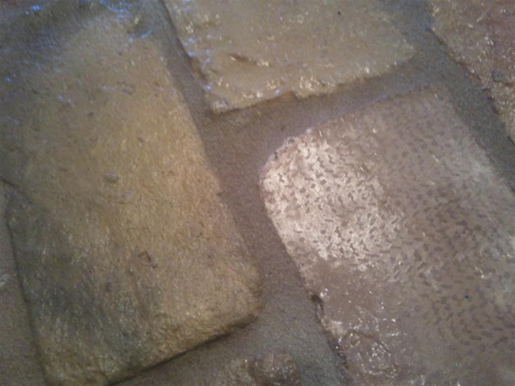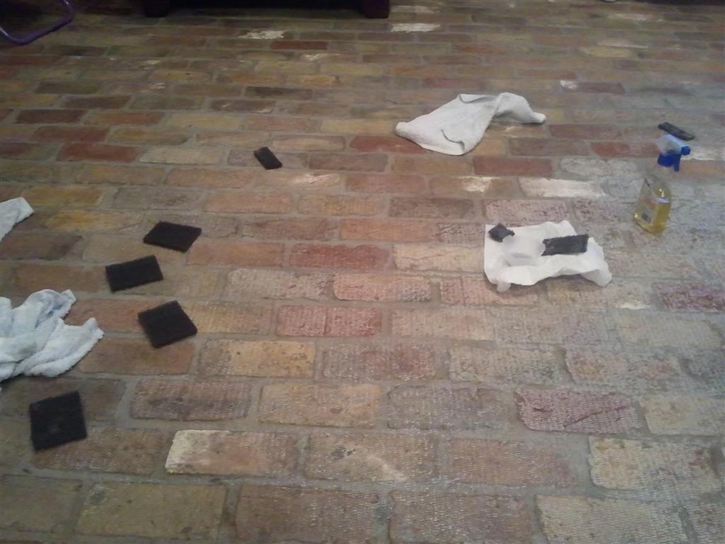 Yup, our living room has a brick floor... pretty cool. But this shiz will not come off. The bricks are sealed, but it's like the pad painted itself onto the bricks. We've scrubbed with different pads, and used Goo-Gone and mineral spirits. It gets the large chunky white shiz off pretty good, but there is still the dark imprint of the outline of the pad.