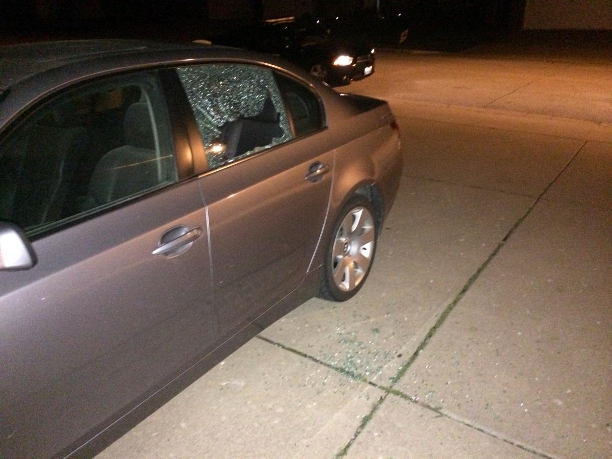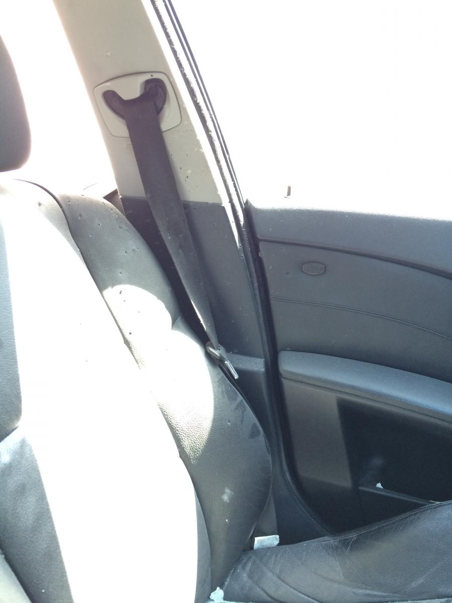 Looks like inside is peppered with shot, driver seats full of bird shot, couple holes in the leather in the back as well. Also officer said the dash and b pillar. Front pass tire is flat. It's having electrical problems also, locks arnt working right so I can only open it with the key. That means I can only get in the drivers door (only mechanical lock) without climbing over and unlocking the other doors. Insides covered in glass so not at the top of my todo list.