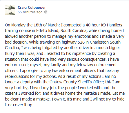 This is a post from the officers face book page. I do not feel bad for him at all. I have no problem at all with people antagonizing cops and getting them to **** up. If you can't keep your cool as an officer, you have no right to have that power.