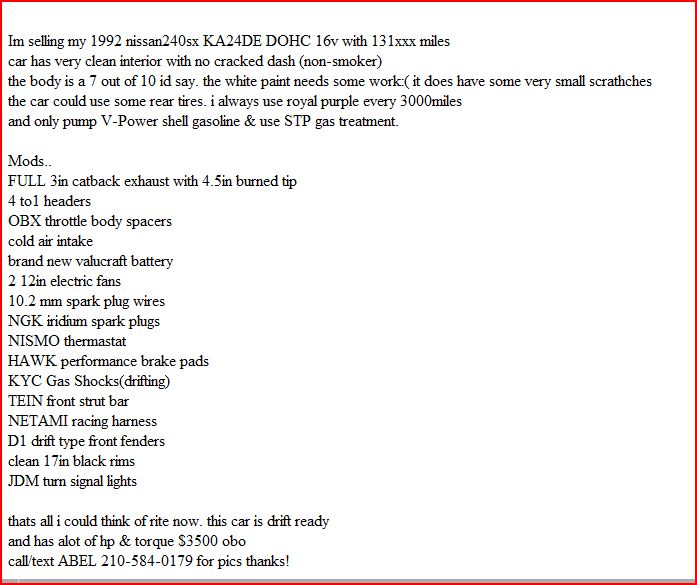 Drift ready, with 3 inch exhaust... why would we need that? Not to mention a burnt tip, i will work on a pic, im sure it is a monstrosity. You should have seen this poor miata we looked at last night. Had the fenders hammered out and dremeled to fit 0 offset wheels that were no longer on the car.