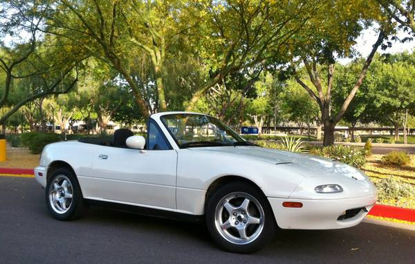 hello I'm helping my elderly friend sell his very clean and Very low mileage 95 Mazda MX-5 Miata. It only has 65xxx miles on it This car was his second/weekend car, and hardly accumulated any mileage in the last 3 years of his ownership, roughly 100mi per year. He just purchased a Jaguar XK8 for the additional comfort level and extra room over the Miata (he's 6'ft tall and in his 80's). Original White paint over black upholstery that is in Excellent condition!! Most recent services to the car included a new radiator, thermostat, hoses and coolant flush, just in time for Arizona summer! This powerful 1.8l DOHC 4cyl and 5-speed transmission are so much fun to drive around town I almost want to buy it for myself! Convertible top is in good overall shape and includes a vinyl tonneau cover. tires are also in good condition. Overall this car need nothing except to be driven and enjoyed!! Asking $7,000 OBO