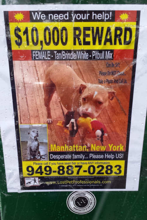 This is a sign I saw this morning at the corner of 42nd & 3rd, advertising a reward of $10,000 for finding a lost dog: