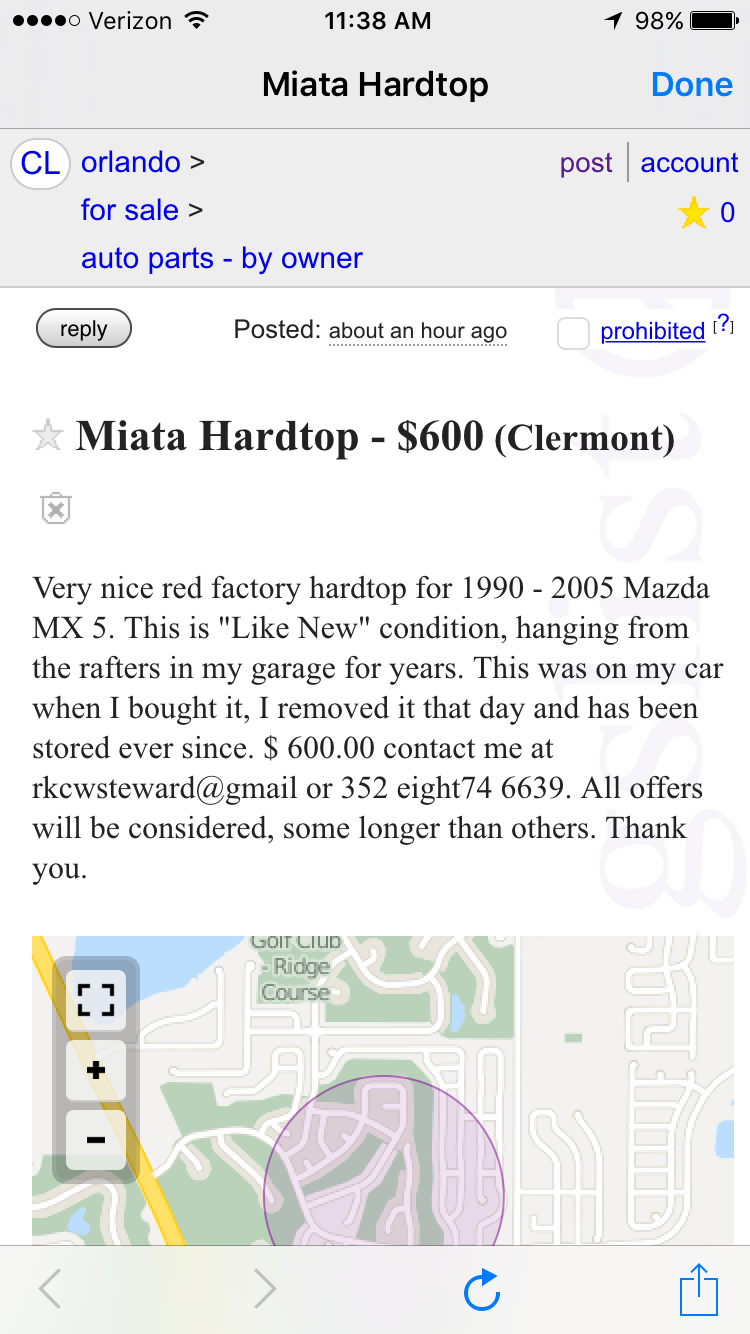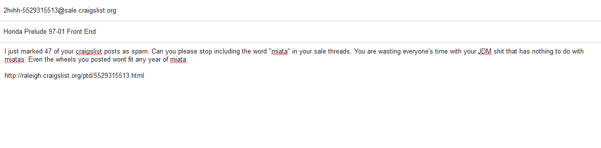 Just for kicks, I searched for Miata on my local CL. A few spam hits (eg: people willing to trade their motorcycle or boat for a Miata, specifically), but mostly on-point. This was on the first page: