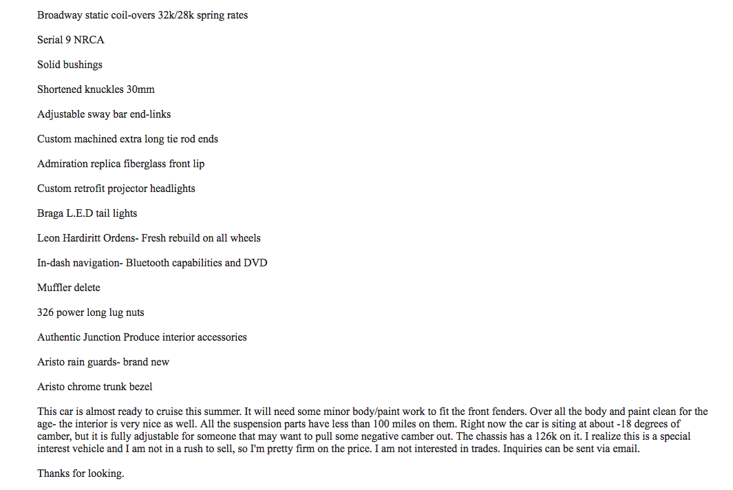 It has brand new rims and tires (less than 500 miles on them), the body is in great shape and shows very well. There are a couple paint touch up spots but nothing major. Interior is in very good condition as well. Has new am-fm-cd-usb stereo, all electrical items work except for the tach. (simple fix)