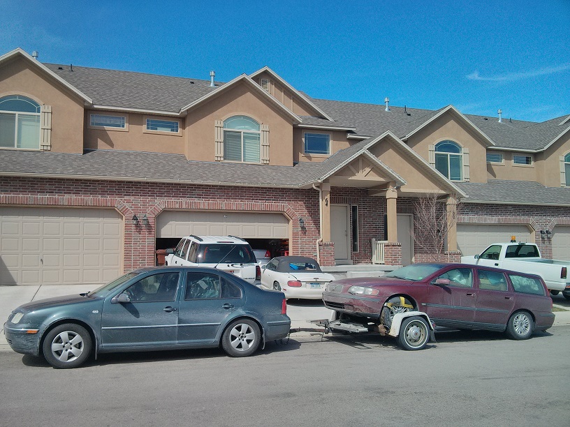 We were out of options. I did some thinking and the Jetta TDIs in Europe are rated to tow something like 3500 pounds. The Volvo's curb weight is like 3250 (was surprised to find it that low... but it's a front wheel drive V70 non turbo). Of course, the back of the Volvo was completely crammed with stuff. I would estimate total Volvo weight to be around 4000 pounds. The tow dolly was probably another, oh, 300? The back of the Jetta was also crammed full. We were out of options, so we loaded it up. Went to bed with a few reservations, no doubt.