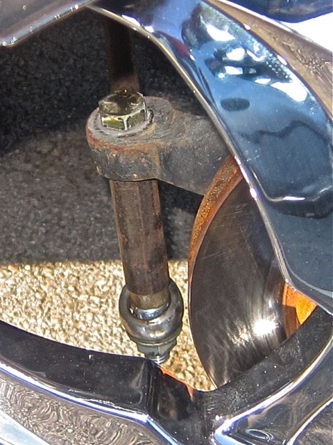 Okay here is just one of the catastrophes with this Donk. Notice the 6-7 inch long pipe used as a spacer to "lower" the steering tierod. Several other concerns but that is the main one…think of the leverage! The owner told me it was fine cuz he used grade 8 bolts. Umm…remind me not to fly in an airplane you "designed".