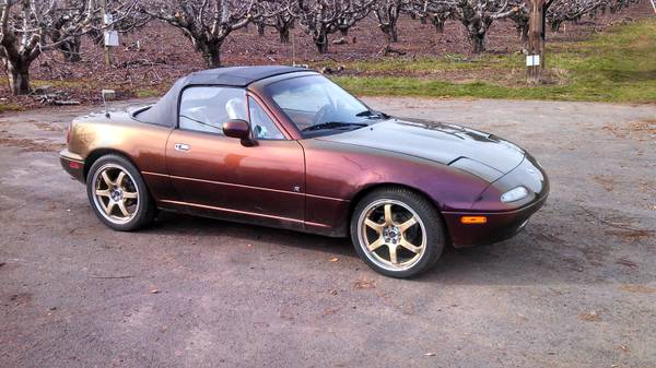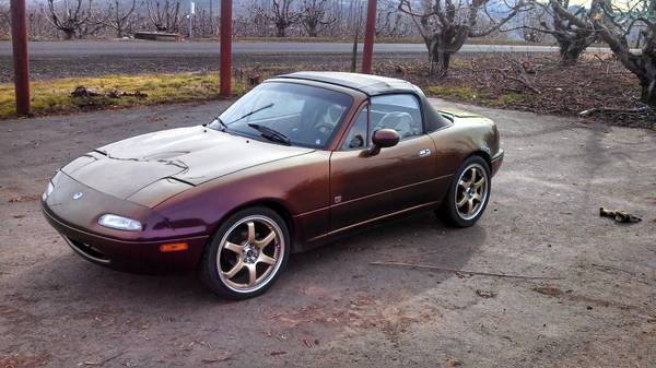 And its so ******* pretty. traded my 04 honda cbr f4i for it. its already on damn decent rims and tires. fresh rebuild with 170k miles on chassis. new top. I need a decent sounding exhaust (needs to be free flowing enough for future turbo) and a good stereo head unit though. it changes colors in the light, deep purple, gold and all sorts of amazing shades. heres the pics I got from the add where I met dude. Im gonna take some of my own soon :P. Hello miata peeps!