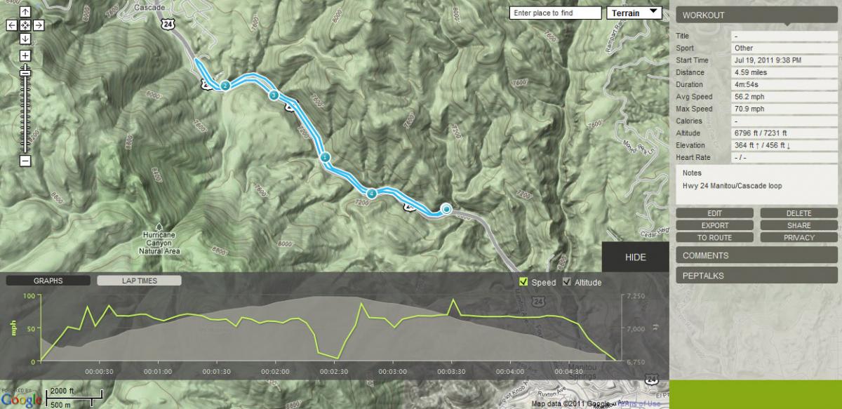 Endomondo is a great fitness/time/distance tracker app free for Apple and Android. I use it for biking and hiking to keep track of my workouts, and I thought I’d give it a shot while driving a favorite road last night and it seems to work pretty well. It gives a breakdown of your speed, time, distance, and elevation of your route, and also overlays it on a variety of Google maps, available on the website and on a phone. You have to let it keep GPS open so it’s not too nice for battery life, but I’ve run it for 2hrs and didn’t drain the entire battery in my Optimus, which has a notoriously shitty battery.