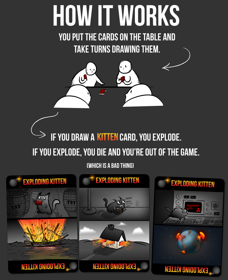 The Oatmeal dude made a card game with kittens. Exploding ones. I found it in my RSS reader this morning and backed it 5 minutes later. Then I thought "Who would truly appreciate this game?"
