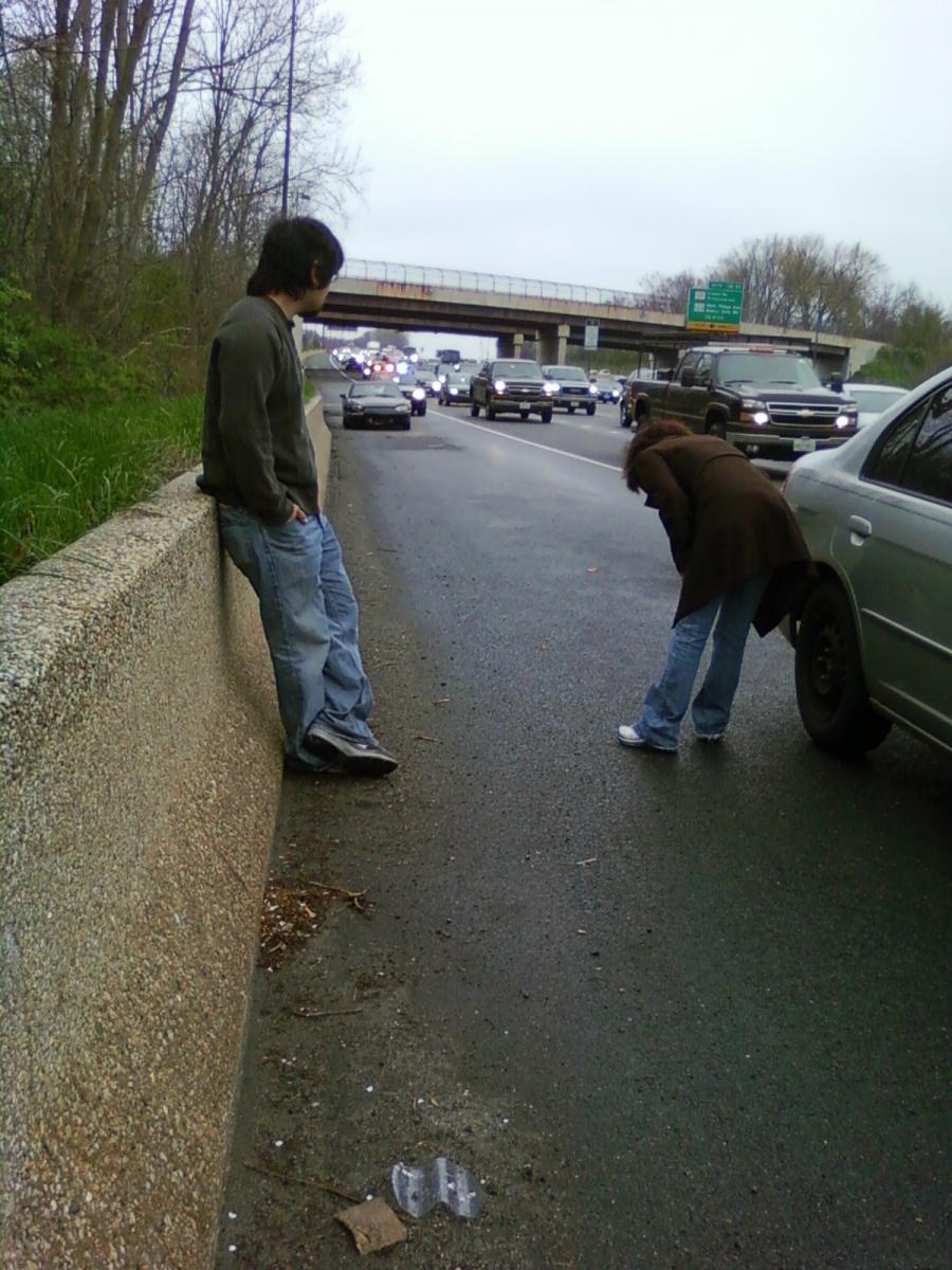 The people that hit me are checking out their car... Ohh, I so badly want to add captions!!!