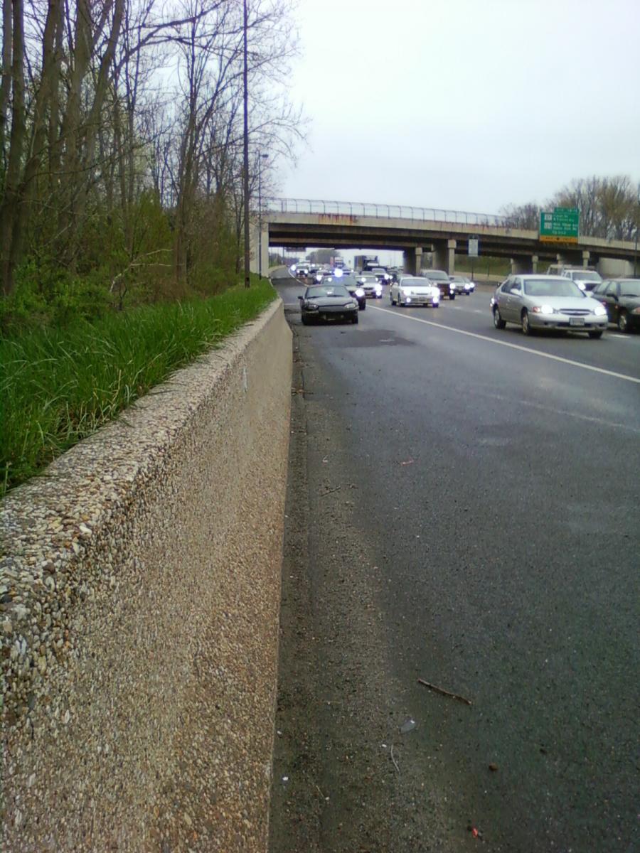 So I am on I270 in the right lane and some dumbass in a minivan decides to stop dead in the right lane and attempt to cut over several lanes all going the same place. My wife and I are putting along at 30 MPH in the right lane and see the minivan make this sudden stop; so I hit the brakes, shoot right towards the shoulder and think we avoided the mess... Nope, not our luck! Just as I am getting ready to cut my wheels back to the left and re-join traffic... WHAM and then WHAM! A few explitives later and a lot of anger boiling from my fingers... I come to a stop. Damn lady behind me in traffic decided to plow us at ~20 MPH and shoot us off the road and into a concrete wall!!!!