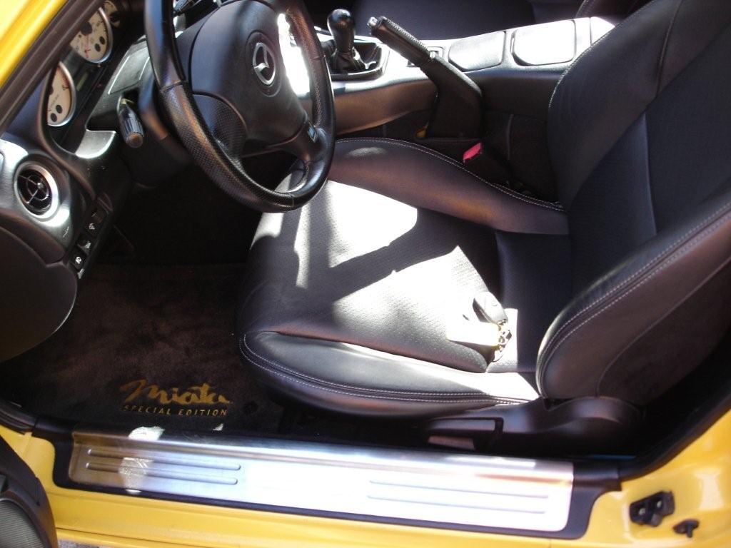 Since my long term plan for Trixie (the black miata) was to paint her orange or yellow and convert the body to the newer 2001 style, I was going to part with some solid $$$ to repaint and refresh my car. Anyhow, in light of the accident I knew that she was not ever going to be right again. So rather than beat this poor girl to death it would just be better to start fresh. So out with the old (and loved) and in with the new (and loved)... Please meet Sandra, our lovely 2002 SE!