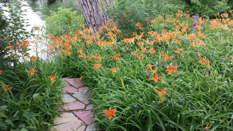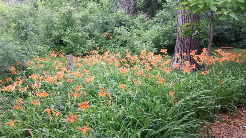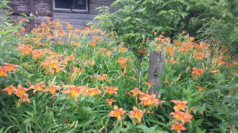 They are lillies. They are about ready to bloom. Orange blossoms about 3" across. They are zero maintenance, as in they looked like that and nobody had touched them in 15-20 years. I haven't done anything but transplant some. They need to be thinned. I could ship you some. They are like a bulb and would ship fine.