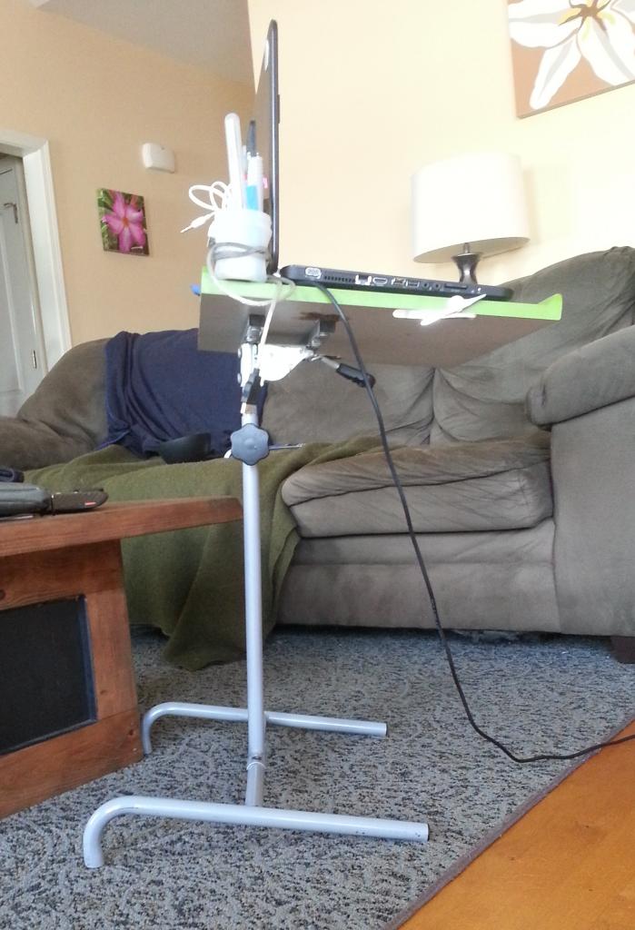 The entire setup is front heavy, so w/e I do will need to extend forward a bit. And the foot needs to stay fairly thin so it will still fit under my couch.
