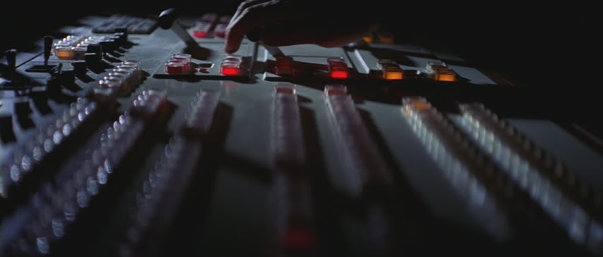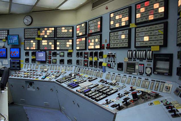 The close-up of the hand pulling the T-bar was shot separately from the main control room scene, which was, in fact, on another continent. Specifically, in the control room of a steam-generating plant in Los Angeles: