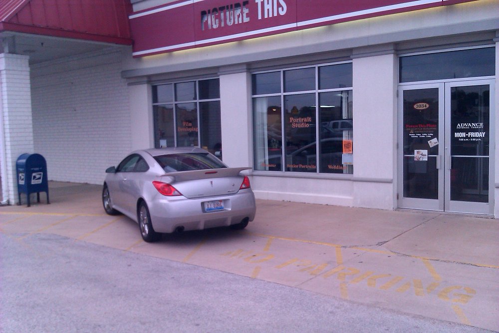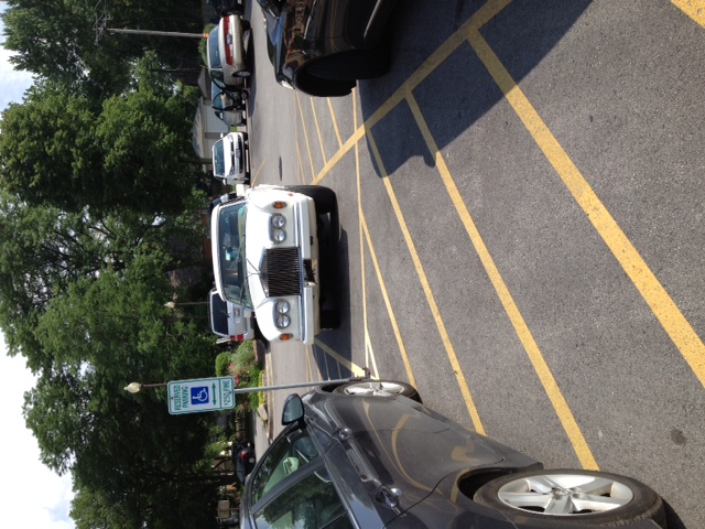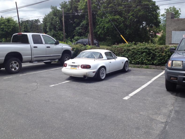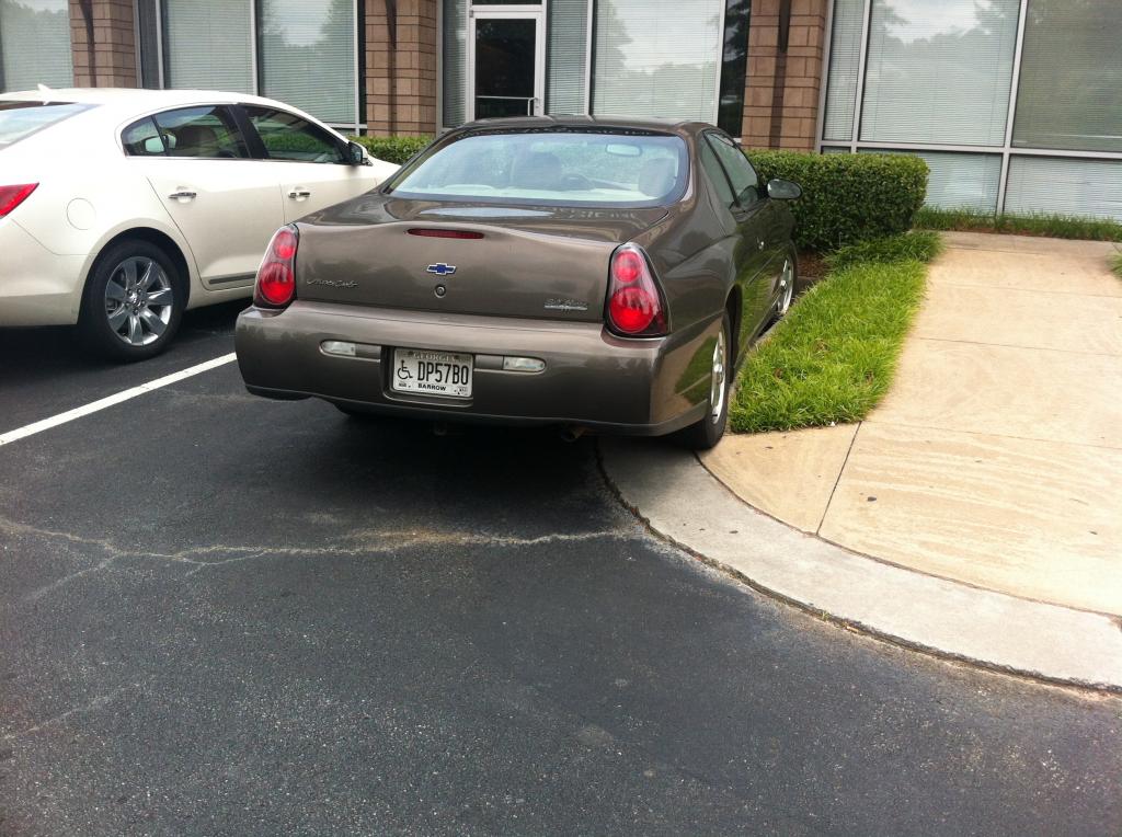 This joker pulled into Quiznos as I was leaving lunch. Made no effort whatsoever to fix it. Just barreled into the spot, smashed into the curb and left it. Four grown men jumped out. I chuckled.