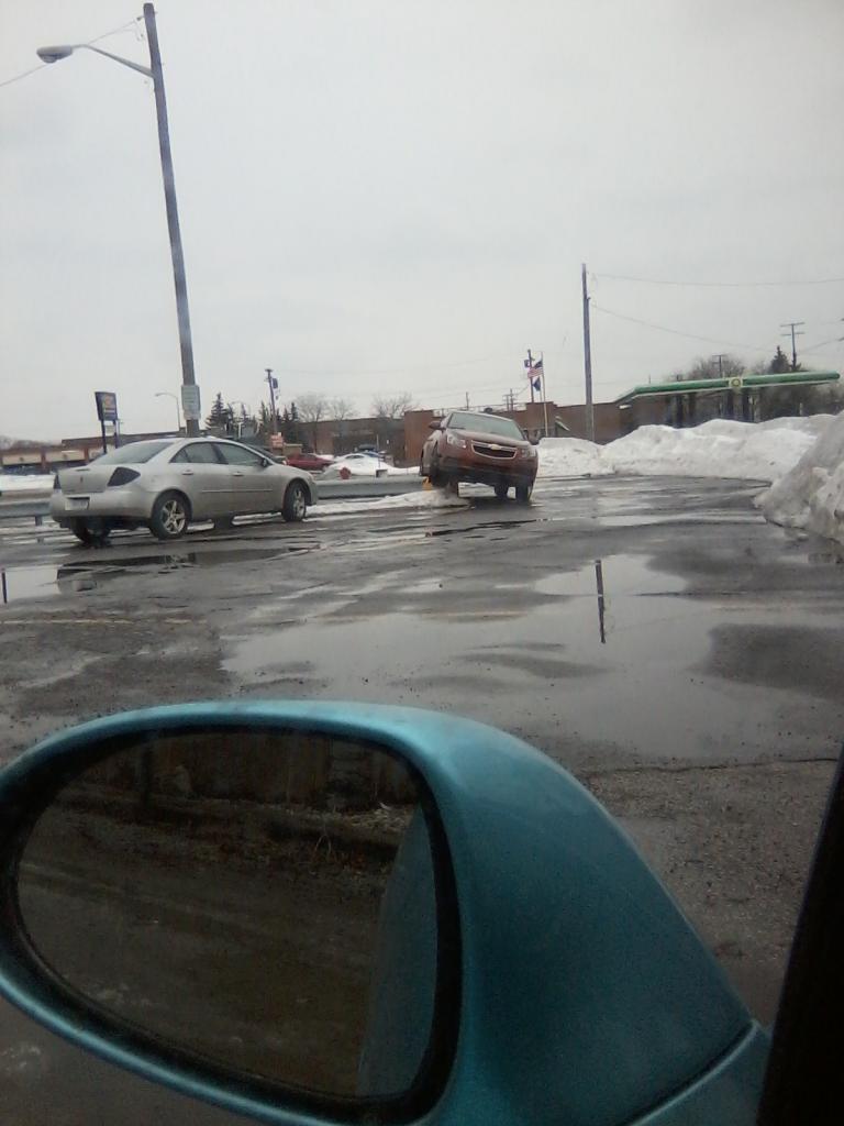 Probably a motorcycle tucked up at the front of that spot when the bimmer parked....and the bimmer owner didn't quite think this one through...