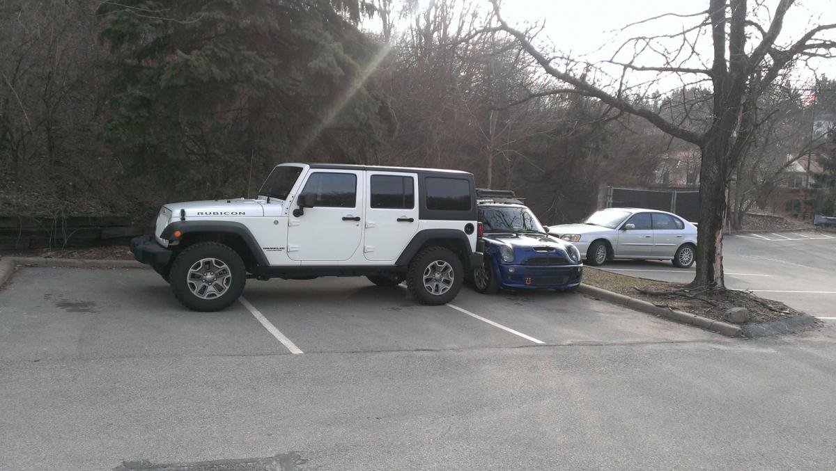 I came to work, and this dude parked his jeep parallel to the spots so nobody would park there.... i was Feeling like an ******* that day, so i squeezed the mini in, and went to work.