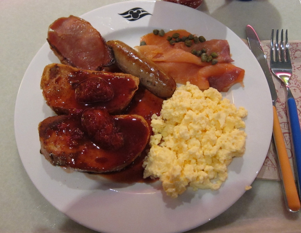 Breakfast, by comparison, has been a relatively pedestrian experience. Just the usual french toast with raspberry compote, Canadian bacon, bratwurst, smoked salmon with capers, and eggs. After a week or so of the same thing, you tend to get bored with it. (I know, first world problem. The gourmet food on this brand new, state-of-the-art mega cruise ship is so repetitive.)