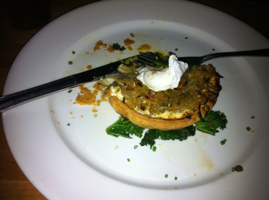 LYONNAISE ONION TARTE CHEVRE, MELTED ONION & LEEK, POACHED EGG & SAUTÉED KALE