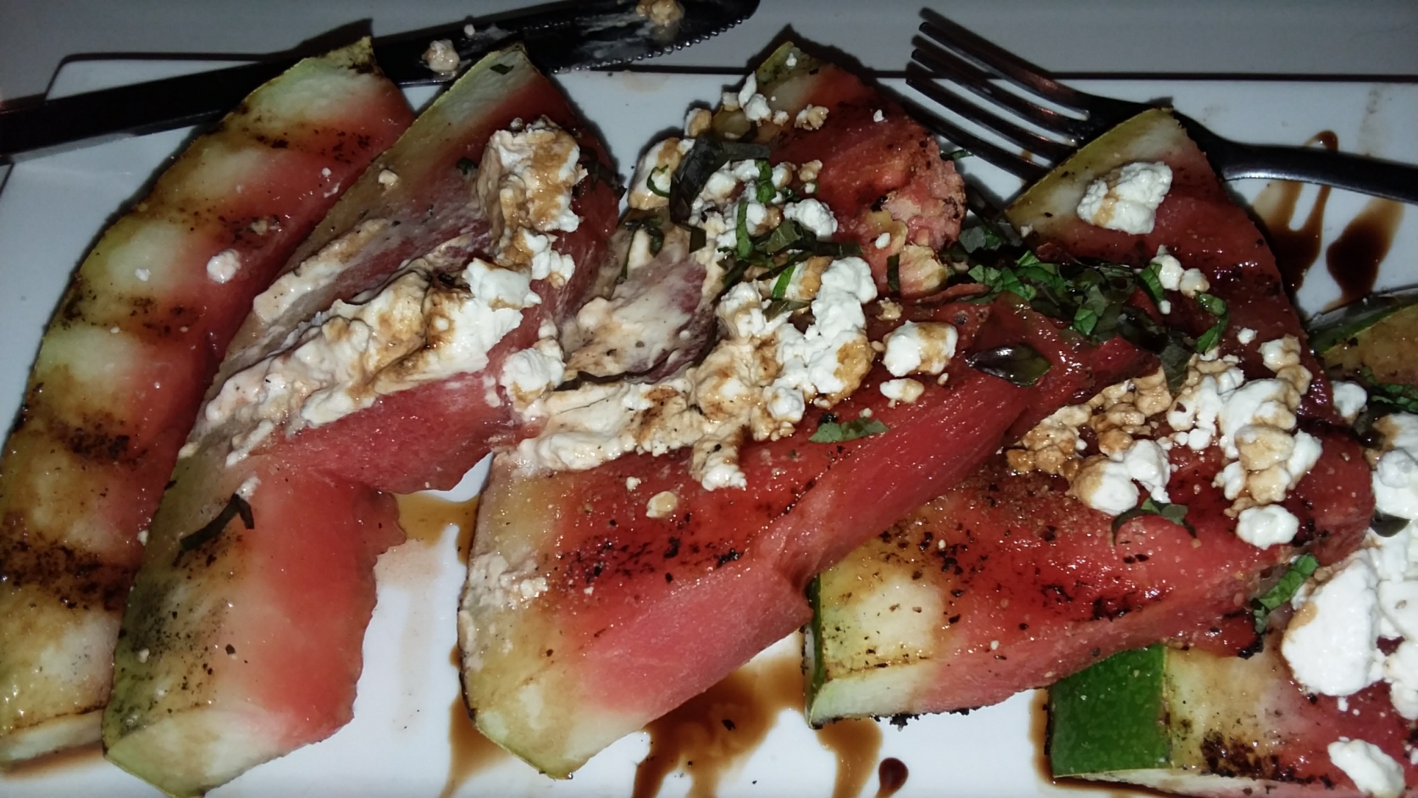 Watermelon seasoned with salt, pepper, garlic, then grilled. Topped with goat cheese, mint, basil, and balsamic glaze. Served still warm with the goat cheese melting.