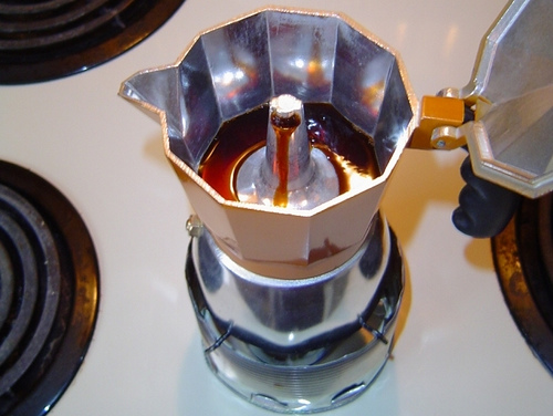 It's an Italian design known as a Moka pot, also used to make Cuban-style espresso. The water starts at the bottom, passes up through a container of grounds in the middle, and comes to rest in the upper chamber.